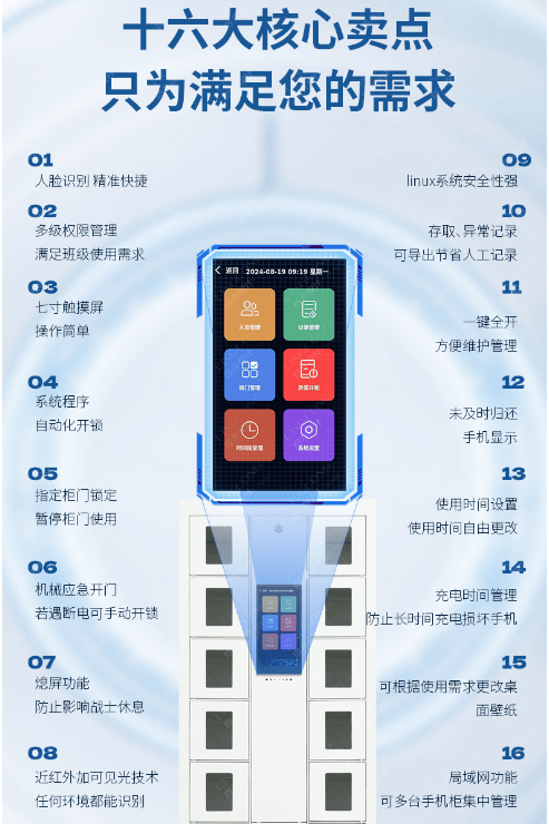 普通管理柜因其操作與功能局限,在一些對便捷性和安全性要求高的場景中,難以滿足需求。例如醫院,醫護人員在緊急救治過程中,無暇翻找鑰匙或刷卡,普通管理柜無法提供快速存取手機的服務,不利于緊急聯絡等情況的處理。而人臉識別手機智能管理柜,在學校里,助力課堂專注度提升,學生刷臉暫存手機,專心聽講無干擾;醫院中,醫護人員刷臉存取手機,全身心投入救治工作;景區內,游客刷臉存放手機,盡情享受美景,拍照打卡隨時存取;企業單位里,員工刷臉管理手機,高效辦公不受打擾。只要有需求,智能管理柜就在身邊,是提升秩序與效率的得力助手。